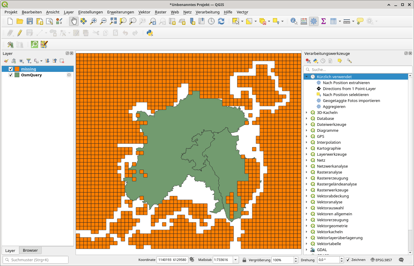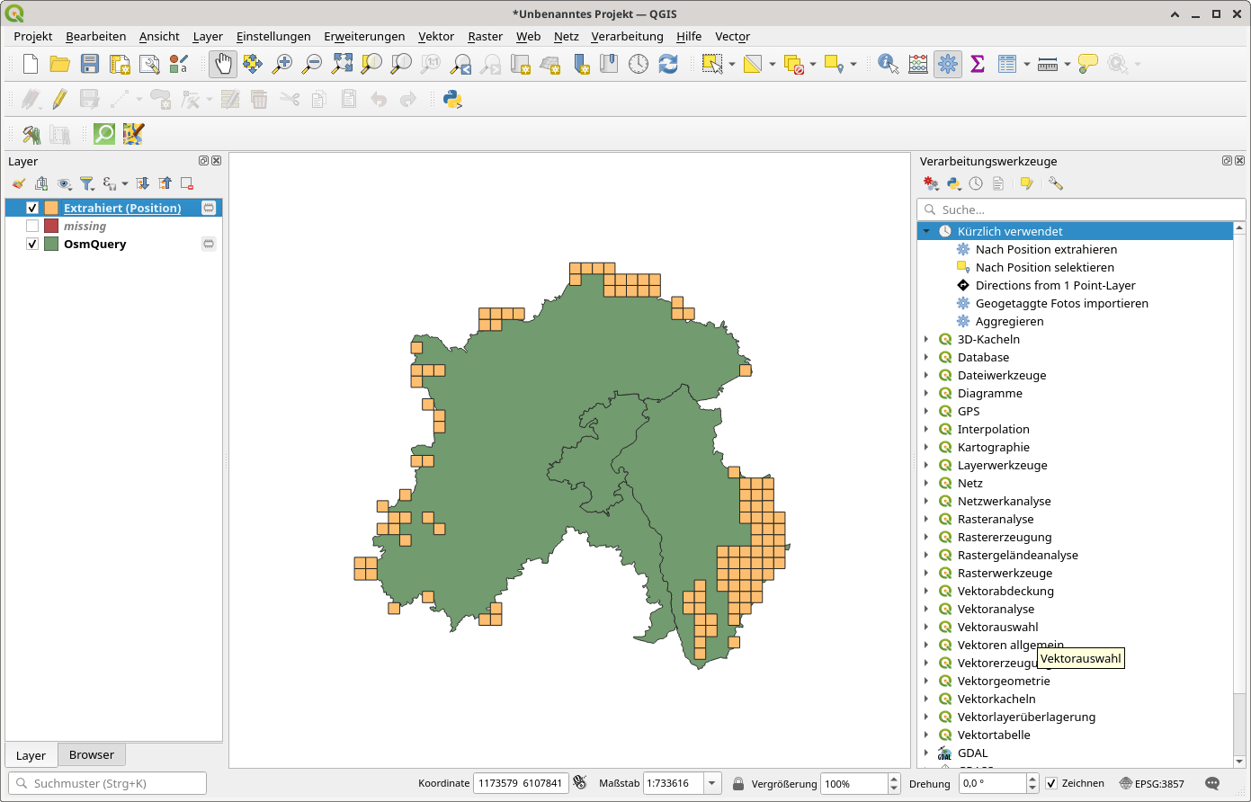 Nach erfolgreicher Ausführung wurde ein neuer Layer Extrahiert (Position) erzeugt, der nur die Tiles enthält, die ganz oder teilweise innerhalb der Gebietsgrenzen liegen.