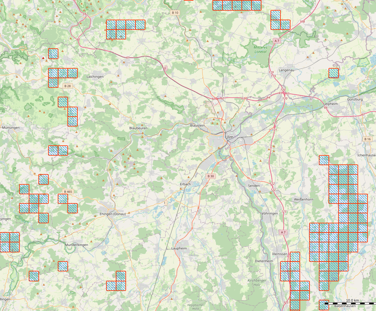 Die aus GeoActivityPlayground im GeoJSON-Format exportierten Missing Tiles der betreffenden Region werden in QGis als Vektor-Layer geladen. Die Gebietsgrenzen kann man z.B. mit dem QGis-Plugin QuickOsm mittels einer Overpass-Turbo-Abfrage wie dieser hier (Stadt Ulm, Landkreise NU und Alb-Donau) herunterladen: