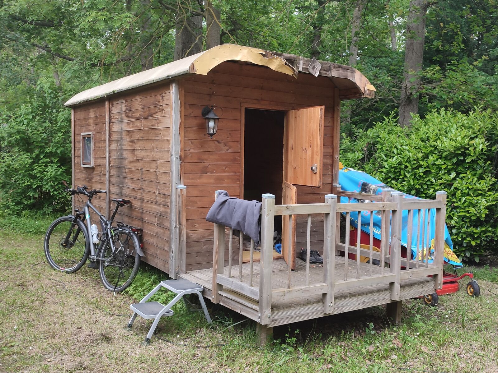 Beim Aufbauen des Zelts bricht dieselbe Stange an einer anderen Stelle. Mir ist gleich klar, dass da erst mal nichts zu machen ist. Ich erkundige mich bei der Betreiberin, ob sie auch feste Unterkünfte vermietet. Eigentlich um diese Jahreszeit nicht, aber um mir aus der Patsche zu helfen, richtet sie die eine “Roulotte” her, die es auf dem Platz gibt. Das ist eine einfache Hütte mit zwei einfachen Betten. Und ich bekomme das auch noch für einen Sonderpreis.